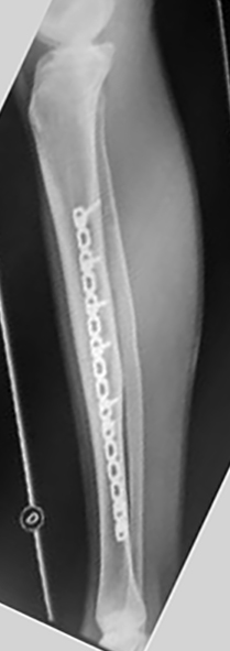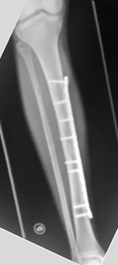 No se colocó ningún elemento ortopédico externo de sostén en el postoperatorio, permitiéndose la movilidad inmediata de las articulaciones adyacentes. Los pacientes una vez dados de alta, fueron seguidos en policlínica a los 15 días de la cirugía y con intervalos de 4 semanas, autorizando el apoyo progresivo del miembro afectado según los resultados radiográficos. La consolidación se definió como la presencia de callo óseo en tres corticales visto en radiografías de frente y perfil, sin movilidad ni dolor a nivel del foco fracturario.
