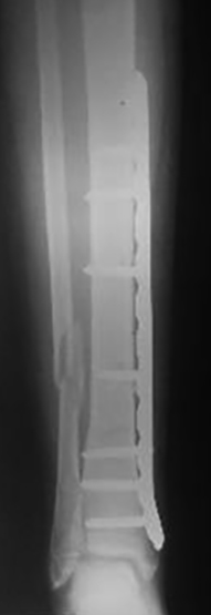 Nuestro estudio tiene limitaciones, el número de pacientes es bajo, es un estudio retrospectivo y no se realizó un mismo abordaje ni se realizó una construcción similar del implante por lo que no se pudieron obtener datos de estas variables. Pero los resultados obtenidos, en cuanto a consolidación, tiempo de apoyo, complicaciones y funcionalidad, son comparables a los obtenidos en la literatura internacional. Creemos que la utilización de la placa bloqueada sería una opción más en el tratamiento de fracturas de tibia con conminución, expuestas y en pacientes obesos, no pudiendo recomendar un método sobre otro.