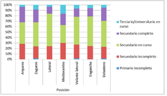 Herbella en su tesis [1] nos muestra que el porcentaje de deserción escolar en el fútbol según la UNESCO es del 25% en el secundario a nivel nacional y que en los arqueros fue del 28,6%. El 67,8 % de los porteros estaban estudiando o completaron el secundario (39,3 y 28,5 %) y llegaron al nivel terciario un 3,6%. Los mediocampistas mostraron mayor compromiso educativo (Figura 1).