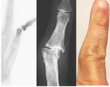Figura 2. Luxación IFP, artrosis meñique y deformidad característica del arquero