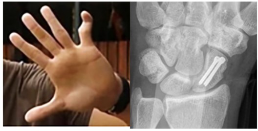 Las lesiones crónicas estarán relacionadas con los tratamientos incorrectos de las lesiones agudas y con el impacto repetitivo que recibe la articulación radiocarpiana al atrapar el balón. Pensemos que en un entrenamiento el arquero puede contactar el balón unas 100 veces. Alteraciones del escafoides, son muestra evidente de ello. De esta manera tenemos las "manos del portero de fútbol" [7]. Estas tienen una articulación radio-cubital ancha, con un leve déficit en la extensión de la muñeca y con ensanchamiento residual en articulaciones interfalángicas. (Figura 3).