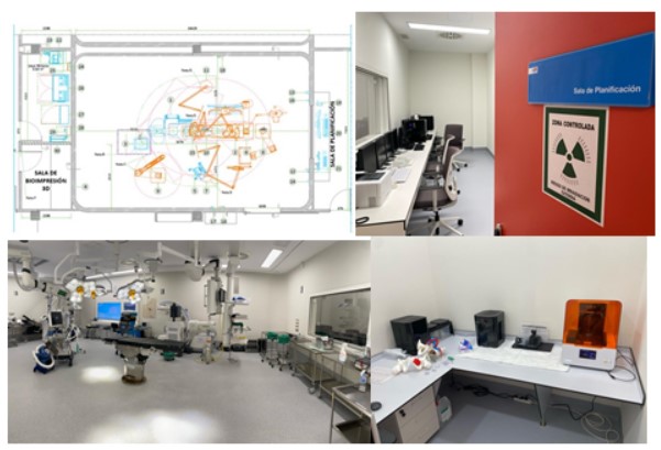 Figura 1. Quirófano híbrido 3D. a) Plano. B) Sala de planificación. C) Quirófano. D) Sala de bioimpresión 3D.
