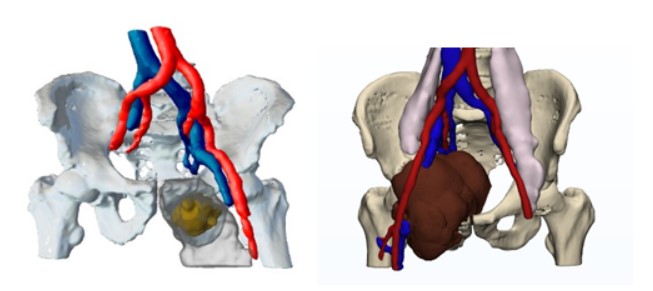 Figura 2. Segmentación de tumor y áreas de interés. Modelo 3D. a) Tumoración hemipelvis izquierda. B) Tumoración hemipelvis derecha