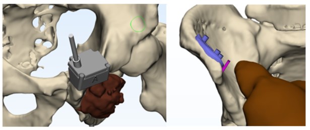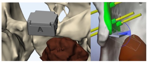 Y en un segundo tiempo intraoperatorio y a partir de las imágenes intraoperatorias se diseña la parte de la guía, o “módulo de ejecución” que permite la orientación de los planos de corte o puntos de entrada para guiado del instrumental (Figura 5).