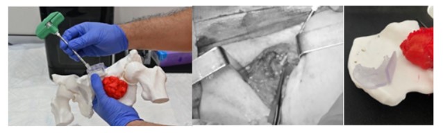 Figura 6. Guía quirúrgica. Tumoración hemipelvis izquierda: a) biomodelo anatómico y guía quirúrgica impresa en 3D, b) utilidad intraoperatoria. C) Tumoración hemipelvis derecha: guía quirúrgica impresa en 3D.