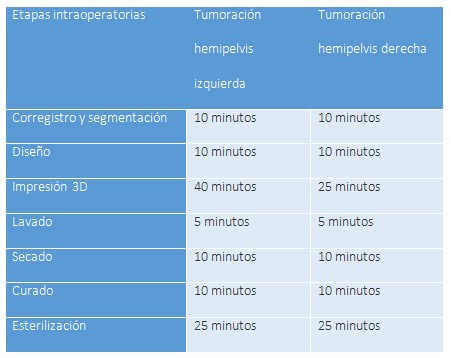 La posibilidad de optimización de los tiempos de producción permite fabricación intraoperatoria de guías de posicionamiento para la obtención de muestras histológicas en áreas de mayor rentabilidad diagnóstica, o la modificación de los planos de corte si ha existido un rápido crecimiento del tumor que invalide la planificación preoperatoria. En la siguiente tabla, se puede observar que el tiempo requerido para la fabricación de una guía quirúrgica modular de posicionamiento, incluyendo modificación de la segmentación, diseño, impresión 3D, lavado, secado, curado y esterilización, puede ser inferior a las 2 horas (Tabla 1).