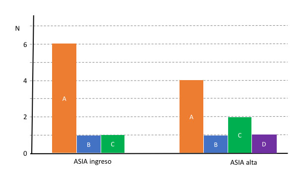 El nivel de lesión cervical fue C4 en el 50% de los casos, C5 en un 37% y C6 en el 13% de los casos. La lesión medular al ingreso fue clasificada en un 75% (6 casos) como ASIA A, 25% (1 caso) ASIA B y un 25% (1 caso) ASIA C. Los dos casos incompletos presentaban un síndrome centromedular de Schneider (Tabla 1).