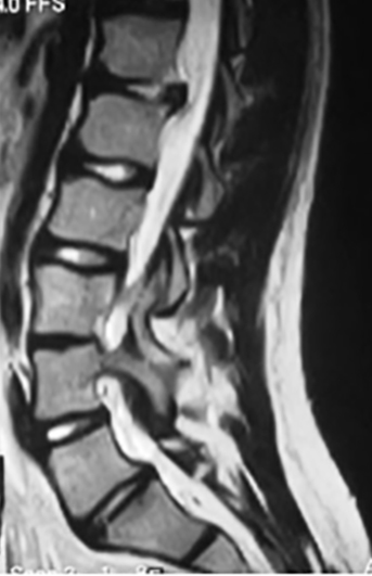 Es menos frecuente que en la población adulta, un 2% de la población pediátrica sufrirá de un disco herniado (21). Usualmente va a estar acompañado de un historial familiar positiva o de traumatismo. El paciente refiere dolor que se irradia hasta las piernas y que aumenta con actividades tan simples como estornudar, estar sentado o parado. El examen físico mostrará un paciente inclinado hacia el frente, con limitación de movimiento de la columna vertebral y dolor al levantar las piernas. El examen neurológico reflejará la disminución de algún reflejo, debilidad o adormecimiento aunque es menos frecuente este hallazgo en los niños que en los adultos (22). La radiografía puede mostrar una escoliosis reactiva al dolor o una disminución del espacio intervertebral, pero el mejor estudio es la RM (Figura 1). El tratamiento inicial será modificar las actividades, procurar descanso y medicación analgésica, relajantes musculares, infiltraciones epidurales y terapia física. Si no hay una respuesta adecuada al manejo conservador o hay alteración neurológica, estará indicada la remoción quirúrgica del disco herniado (22).