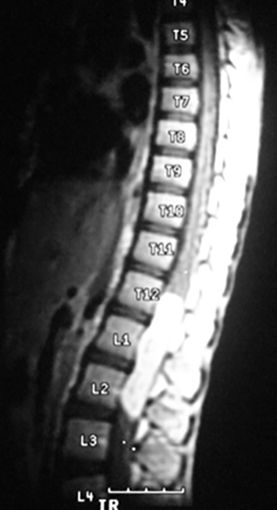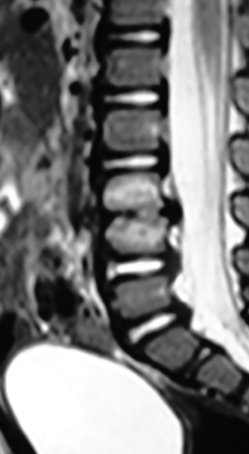 Las causas infecciosas se deben considerar en la evaluación de un niño con dolor de espalda. La discitis aparecen en dos picos de edad, en niños menores de 5 años y en niños de 10 a 14 años (36). La presentación puede ser tan variada que puede incluir además de dolor de espalda, dolor abdominal, cojera o rechazo al caminar. El examen físico mostrará límite al movimiento de la espalda y dolor a la palpación localizada. Radiográficamente los hallazgos se observan atrasados con relación a los hallazgos físicos. De verse algún hallazgo, será la irregularidad de los bordes vertebrales, usualmente entre L2-L3 o L3-L4. El mejor estudio es la cintigrafía ósea para localizar la lesión y la RM para definir la extensión especialmente si hay un absceso epidural, que requiera drenaje quirúrgico inmediato (Figura 5). Los laboratorios mostrarán una elevación de la velocidad de sedimentación, mientras que el nivel de glóbulos blancos solo se elevará en un 10% - 40% de los casos. Por lo tanto, el nivel de los glóbulos blancos no es confiable (36).