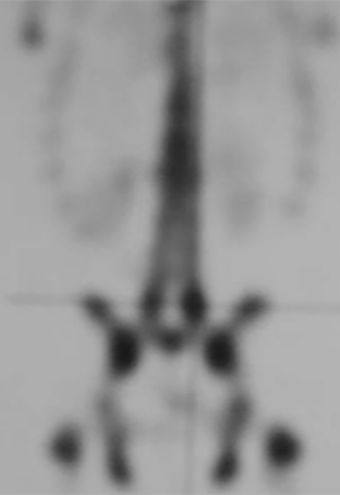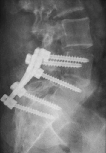 La espondilolistesis es cuando el defecto de la pars articularis es bilateral y se produce un desplazamiento o subluxación de la vértebra superior sobre la inferior. Es más común en la L5 sobre el sacro. La posibilidad del desplazamiento viene determinada por el potencial de crecimiento, por la presencia de cifosis lumbo-sacra y del grado de desplazamiento de una vértebra sobre la otra, al momento de la evaluación inicial. Es más frecuente el desplazamiento en pacientes mujeres jóvenes, cuando el desplazamiento inicial de una vértebra sobre la otra es mayor del 50%, cuando el tope del sacro es en forma de domo o cuando la unión lumbo-sacra es displásica. Se clasifica dependiendo de la etiología (congénita, ístmica, traumática, patológica e iatrogénica) o por el porcentaje de desplazamiento de una vértebra sobre la otra (clasificación de Meyerding). El historial mostrará un dolor de leve a moderado que se irradia a las piernas, se agrava con actividades y se alivia con el descanso. El examen físico observa una disminución de la lordosis lumbar, espasmos de los músculos isquíaticos con un caminar rígido. El diagnóstico se puede ver en radiografías lumbares laterales, pero las vistas oblicuas serán de gran ayuda en los casos más difíciles. En casos no evidentes puede ser de ayuda la cintigrafía ósea que mostrará hipercaptación en el área afectada (Figura 3). Además, la cintigrafía ósea permite saber el estadio de saneamiento. Si es agudo, habrá captación, si es crónico no habrá tanta captación. Al ser agudo, se espera mayor probabilidad de curación con tratamiento conservador y si es crónico la posibilidad de recuperación será muy pobre (34). La TC ayuda a delimitar el área más afectada. El tratamiento dependerá en el grado de desplazamiento y los síntomas. El tratamiento conservador consiste en modificar las actividades, medicación analgésica, una abrazadera y terapia física. La cirugía se indica cuando la terapia conservadora no mejora los síntomas, si hay alteraciones neurológicas o cuando el desplazamiento de una vértebra sobre otra es mayor del 50% (35). Quirúrgicamente se puede hacer una artrodesis in situ, sin instrumentación con una probabilidad de resolver el problema en un 70 % de los casos o una artrodesis instrumentada, con reducción o sin reducción del desplazamiento. La instrumentación permite corregir el defecto, aumenta la probabilidad de la fusión y mejora la mecánica espinal (Figura 4).