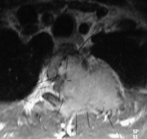 El sarcoma de Ewing y los osteosarcomas son los tumores óseos malignos más comunes de la columna vertebral (Figura 8) (Figura 9). La leucemia puede causar dolor de espalda además de fatiga, letargia, palidez, hematomas, sangrado, anemia y fiebre (17). Las radiografías mostrarán fracturas de compresión, osteopenia, y las líneas metafisarias leucémicas. La analítica muestra cambios característicos de la leucemia y ortopédicamente el problema de la espalda se tratará con abrazaderas para darle soporte a la columna vertebral.