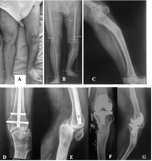 Figura 5 : a, b, c) paciente masculino de 35 años de edad, que sufre de hemimelia peronea del miembro inferior izquierdo. Presenta gonartrosis grave homolateral, osteosíntesis femoral homolateral y deformidad tibial de 20° en varo y 28° de antecurvatum; d, e) gonartrosis grave, subluxación posterior de la tibia y patela baja. f, g) A-P y perfil de la ATR. Fue necesario realizar una osteotomía de la TAT.