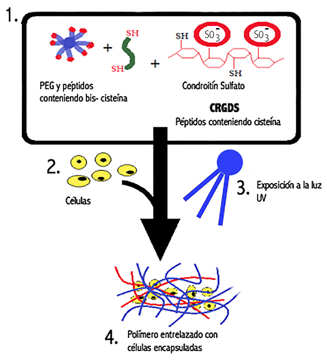 Nuestro equipo ha desarrollado y analizado un hidrogel basado en un reticulado de PEG, en el que se han introducido análogos de MEC, condroitín sulfato (CS) y ácido de arginina-glycina-aspartico (RGD), para crear un hydrogel biomiméticamente similar al cartílago (39) (Figura 1). El CS es el principal glicosaminoglicano y crea un microambiente hiperosmótico y promueve síntesis tisular, bajo compression dinámica (40-42). Por otro lado, el RGD, es un péptido para la adhesión celular que provee que las células censen la rigidez del substrato y actúa como un mecano-sensor para la compresión dinámica (43). Este mismo ha demostrado soportar la condrogenesis (44)(45) y a concentraciones bajas mejora la diferenciación celular (45). Este precursor de hidrogel es fotopolimerizable con luz ultravioleta (UV), por lo cual los diferentes componentes se modifican con grupos que reaccionan y pueden entrelazarse entre sí, formando un polímero entrelazado ante la exposición de luz UV (Figura 1). Además, este hidrogel permite la encapsulación de células durante su formación, siendo la combinación formada in situ en el defecto a tratar (Figura 2 ). Las ventajas incluyen el control temporal y espacial durante la formación del hidrogel, la habilidad de polimerizarlo a pH y temperatura fisiológica y de forma rápida, de segundos a minutos (46).