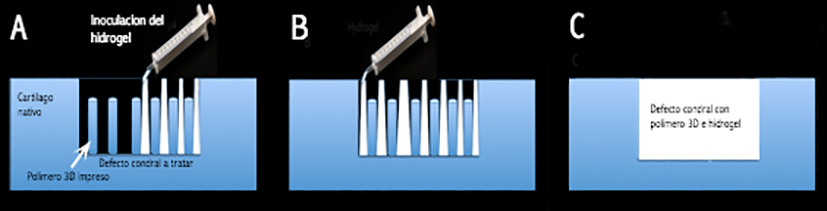La combinación de hidrogeles condrogénicos con estructuras bioimpresas 3D previa a la inoculación del hidrogel, dentro del defecto a tratar, podría ser una terapia prometedora. Las estructuras 3D permiten aportar una plataforma mas fuerte hasta que el hidrogel con MSCs puedan regenerar el defecto. Además, estas estructuras impresas 3D podrían asistir en la integración del hidrogel al hueso subcondral y tejido circundante (104)(105). La técnica propuesta consiste en la inyección del precursor del hidrogel entre las estructuras 3D impresas (Figura 5) (Figura 6).