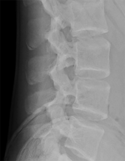 Figura 1: Radiografía lateral de columna lumbar, obsérvese esclerosis y desplazamiento del centro de osificación secundario de las apófisis espinosas de L2, L3 y L4 con esclerosis del fragmento y fragmentación en L3.