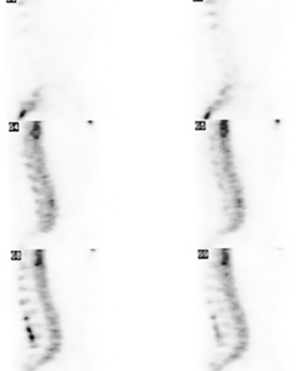 Figura 2: Figura 2 Gammagrafía con Tc99, se aprecia hipercaptación en las apófisis espinosas de L2, L3 y L4.