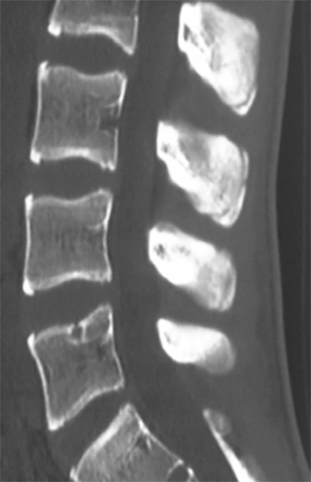 Figura 3: Figura 3 Tomografía axial computarizada, corte sagital de columna Lumbar, se observan focos de apofisitis en L3-L4-L5.