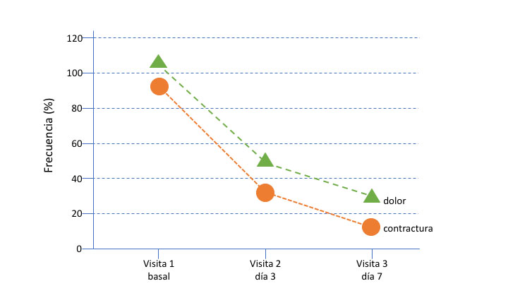 Figura 1: Perfil de frecuencia de pacientes con dolor y pacientes con contractura. El tratamiento finalizó al 5º día y la valoración de los síntomas concluyó a los 7 días