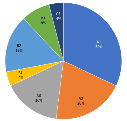 Los sectores diafisarios afectados fueron tercio medio en 13 (52%), y tercio inferior en 12 (48%) pacientes. En 13 pacientes (52%) las fracturas fueron del lado derecho, en tanto que en 12(48%) fueron del izquierdo. La clasificación del tipo de fractura, según la clasificación AO se refleja en la Tabla 2 (Figura 1). No hubo fracturas tipo C1 y C2. Se registraron 7 fracturas expuestas (28%), siendo 6 izquierdas. Según la clasificación de Gustillo fueron una de tipo I (14,3%), otra de tipo II (14,3%), y 5 de tipo III (71,4%) (Tabla 2).