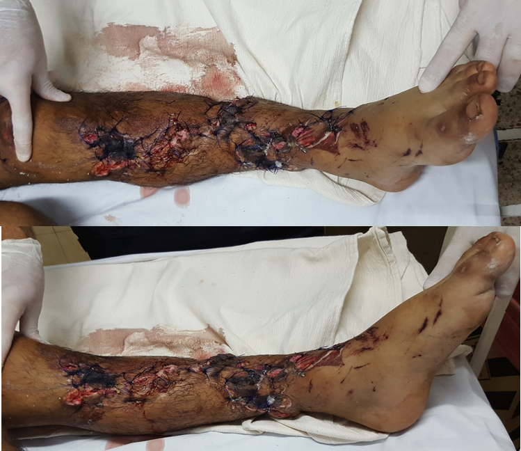 Atendimos a un varón de 19 años de edad, con antecedente de consumo de sustancias ilícitas, que sufrió un accidente con su motocicleta, con traumatismo de alta energía, e ingresó en nuestro centro, en enero de 2017, derivado desde otra institución, por patología neuroquirúrgica. Se realizó la evaluación ortopédica 4 días después del accidente, a solicitud de servicio de terapia intensiva, por presentar lesión en la pierna izquierda, suturada en el centro asistencial inicial. Se observó una herida suturada con secreción purulenta esfacelos, deformidad y movilidad patológica en la pierna (Figura 1).