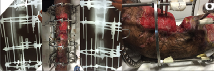 El tratamiento consistió en un desbridamiento extenso del tejido óseo desvitalizado, extirpación de las partes blandas afectadas con el proceso infeccioso y con signos vitales dudosos, obteniendo como resultado una pérdida final de 12 cm de hueso, la pérdida de tejido muscular de la región antero-lateral de la pierna y la cobertura de todo el segmento mencionado. Posteriormente, se colocó un fijador circular tipo Ilizarov prearmado y medido, manteniendo la alineación y el eje mecánico entre las articulaciones proximal y distal. Como acto final se realizaron las osteotomías metafisarias, distal y proximal.