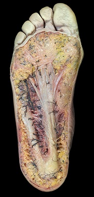 La fascia de la planta del pie se origina, proximalmente, en la porción plantar medial del calcáneo, se divide en cinco fascículos, para terminar distalmente, en las articulaciones metatarso-falángicas, donde se confunde con los ligamentos capsulares. La aponeurosis plantar conecta el calcáneo con los dedos del pie a través de las placas plantares .