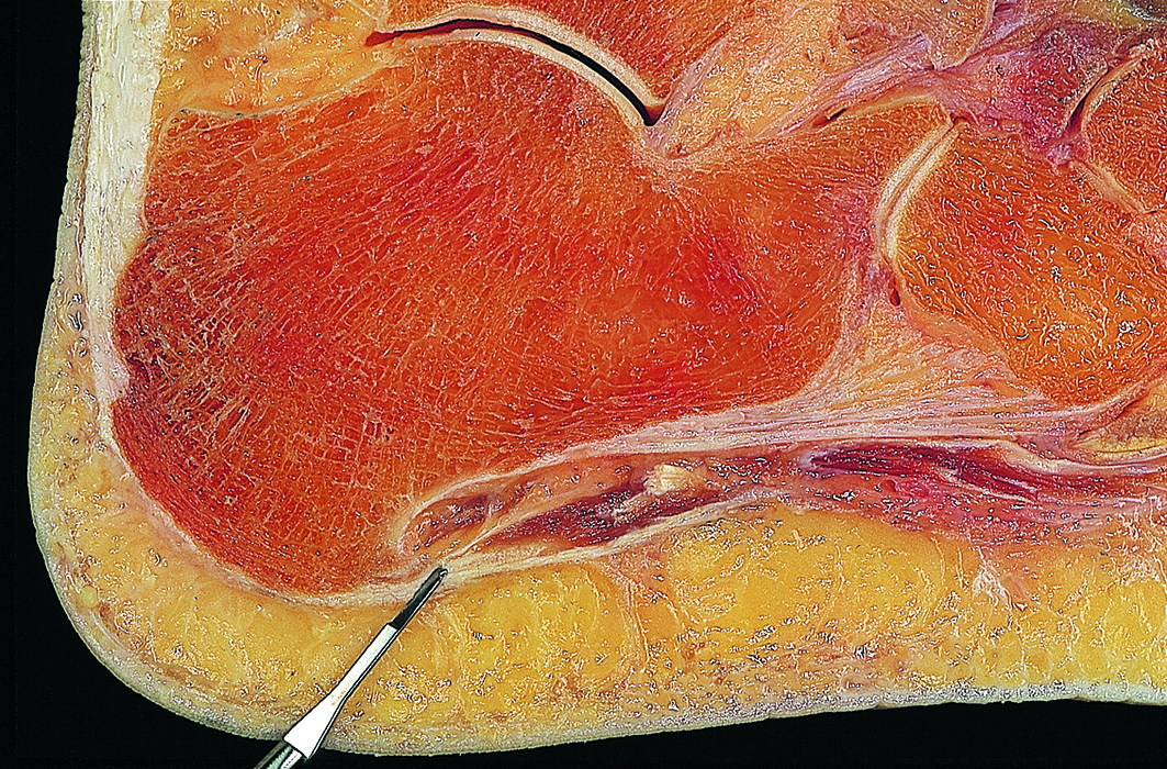 El espolón está orientado a lo largo del eje de la fascia plantar y del m. flexor digitorum brevis en el 50% de los casos [41]. El m. flexor digitorum brevis se inserta en la apófisis interna de la tuberosidad del calcáneo o en el vértice del espolón del calcáneo si está presente, por delante y por encima de la inserción de la fascia plantar, concretamente en el periostio [53].