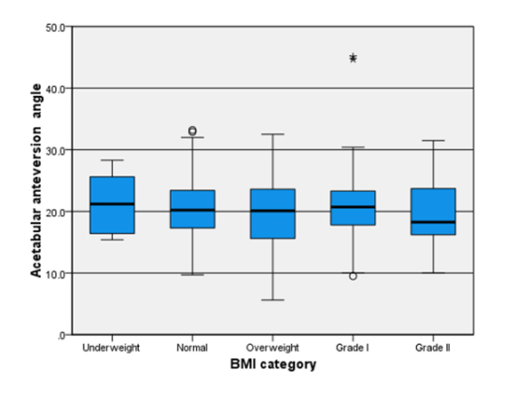 Conclusion: Even though a tendency of a decreased acetabular anteversion on higher BMI classified patients was found, there is not a statistically significant relationship between BMI and acetabular anteversion angle.